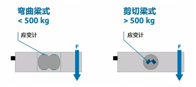 在弯曲梁式中,应变片是水平安装的,承重在500公斤以下;在剪切梁式中,应变片垂直安装,承重范围从500千克到10000千克。 |