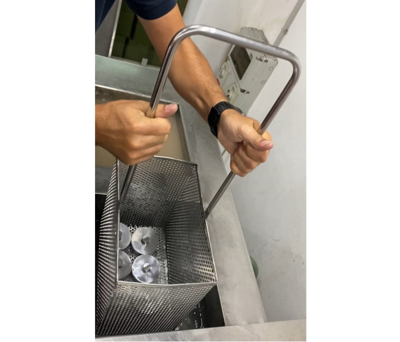 操作者将大约10公斤的称重传感器弹性体放入篮子中,然后将其放入温度为70°C的水中。在这里,称重传感器弹性体会受到一系列70Hz的超声波冲击,持续2-5分钟,然后冲洗干净。
