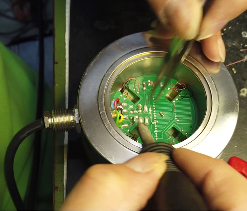 最后一步,焊接并联电阻,以补偿温度变化导致的弹性体材料弹性模量的微小变化。