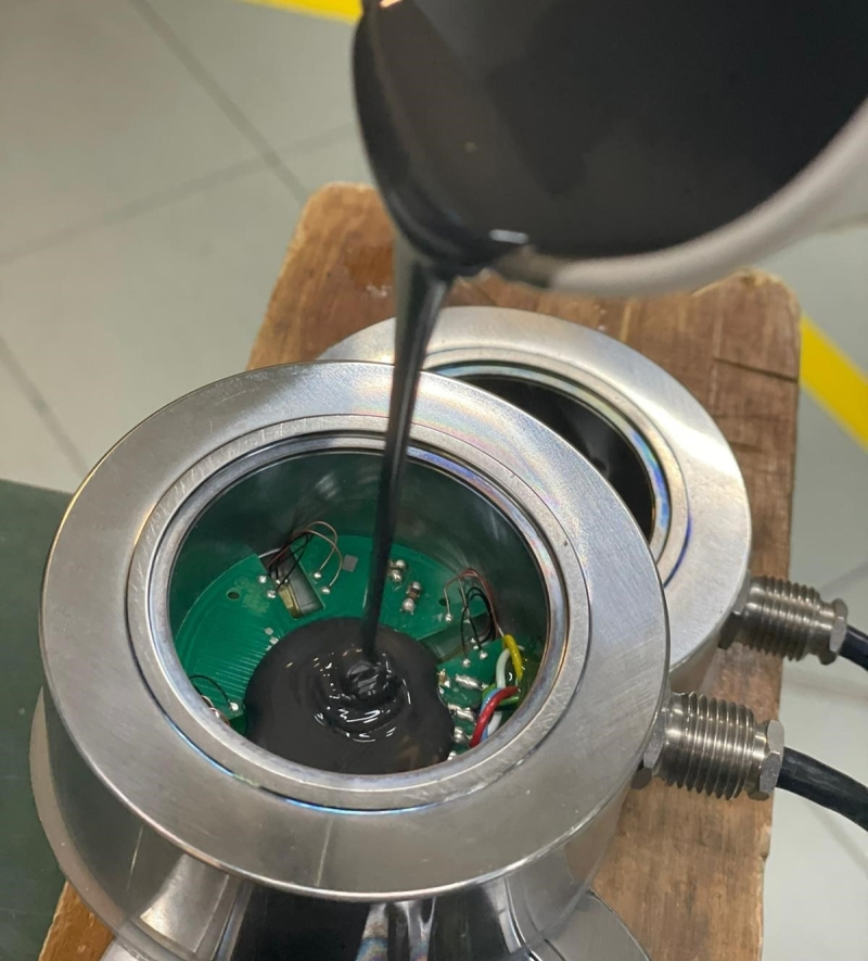 在灌封的第一步,是将称重传感器侧放,然后将环氧树脂浇注在配线阶段已焊接到PCB上的电缆入口处。
