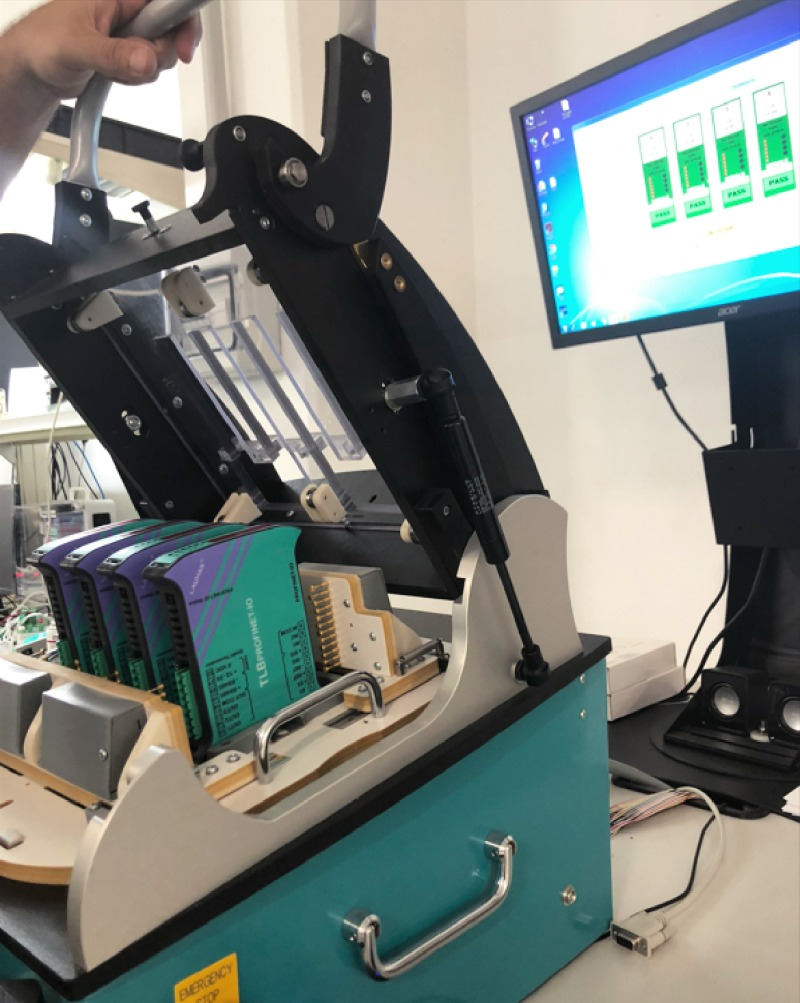 操作员将产品放入检测设备,通过运行有线性引导程序、使用镀金触点的检测仪器端子排与其连接。
