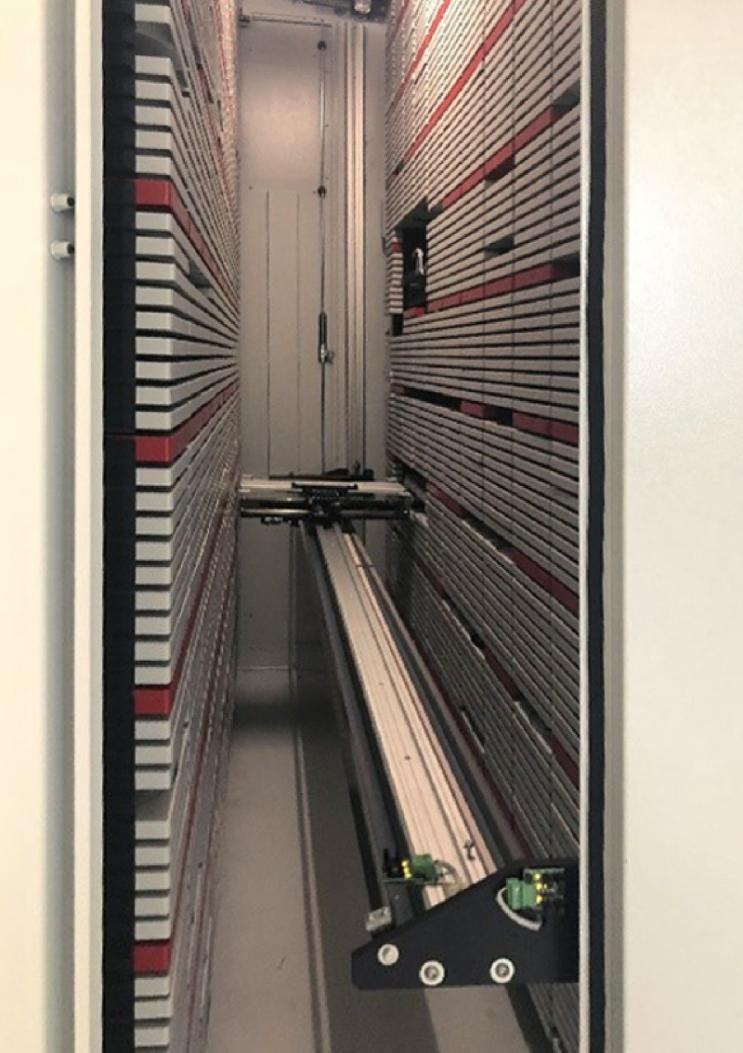 ![]() 机械臂在自动化仓库中拉开装有电子器件的抽屉。 |