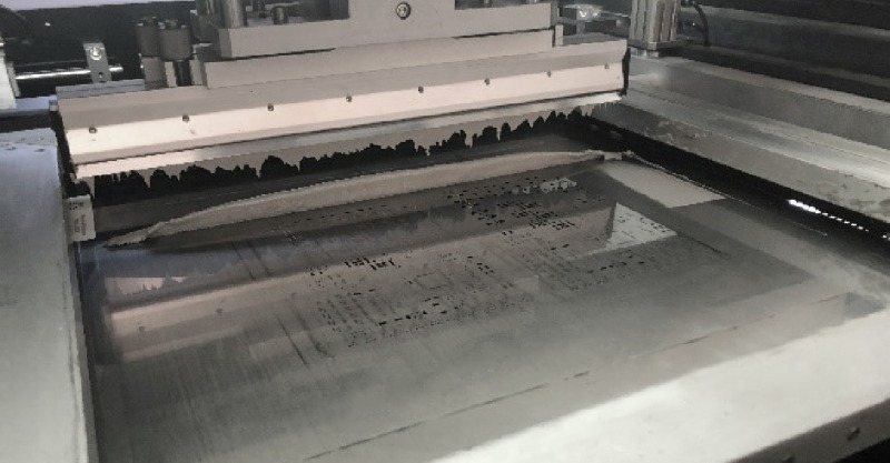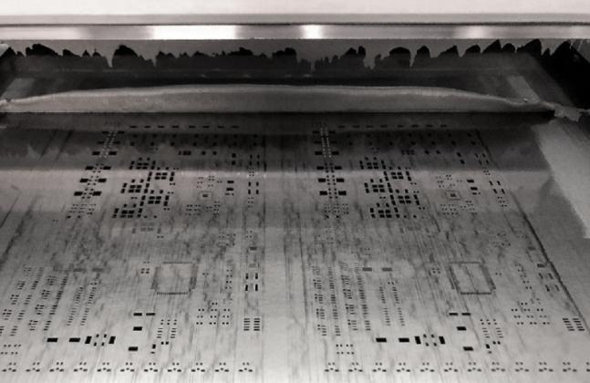 操作员在机器内放置以下物品:电路板器件定位钢网,一块预先加工有与印制电路板设计焊盘位置相匹配的精确定位孔的钢制工装,器件将被放置在焊盘上进行焊接。