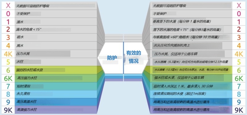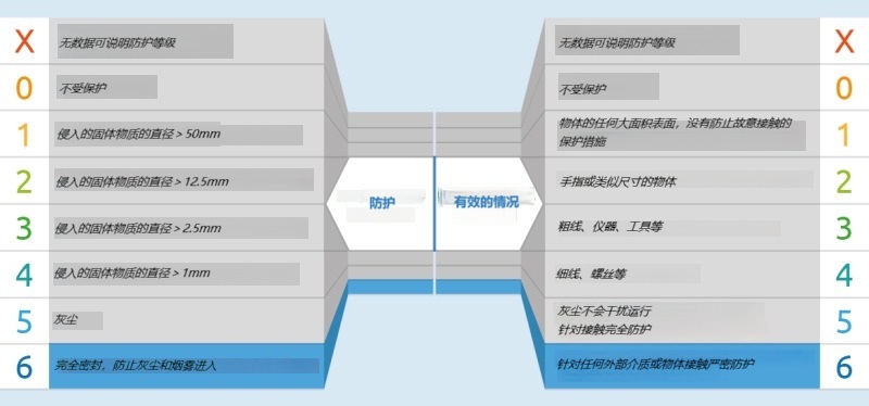 数值范围从0到6,其中6表示外壳完全密封,可防止灰尘和烟雾进入,并具有完全的防接触保护。